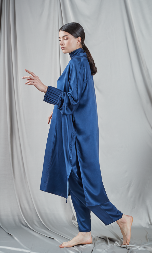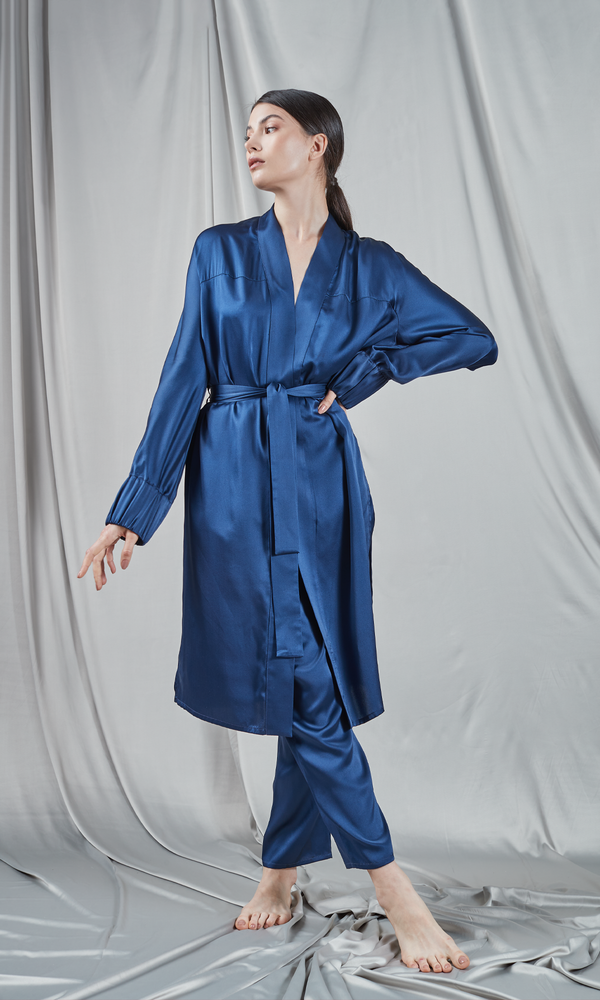 Kimono in a beautiful shade of navy blue, an example of elegance and comfort. It is made of glossy silk, which gives it a luxurious look and a fluid fall. The simple design, with clean lines, is embellished by a high collar that adds a contemporary detail. The long sleeves are finished with elastic cuffs, bringing a subtle contrast of shape and texture. The kimono is open at the front and can be fastened at the waist with a matching cord, allowing for adjustment according to preferences. The piece can be worn in various contexts, whether it is an extra layer of elegance over an evening outfit or as a main item in a relaxed outfit at home.