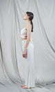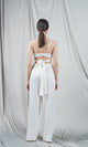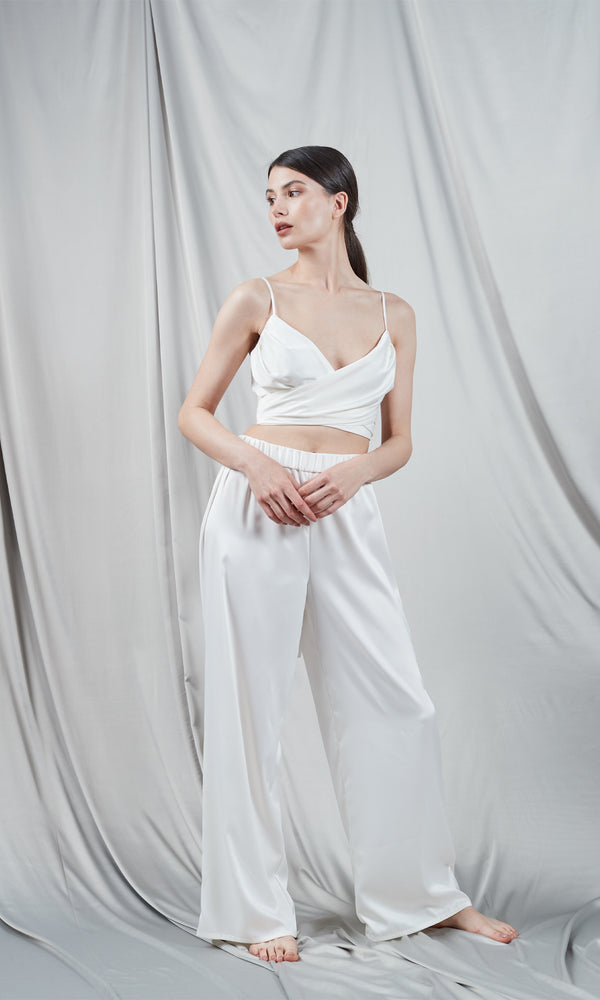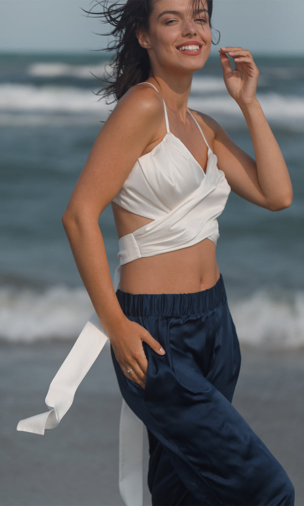 Ivory top, defined by its elegant and feminine simplicity. It is made of satin that accentuates the delicacy and finesse of the fabric, giving it a high-quality look. With a deep V-neck and thin straps, the top gracefully sculpts the neck and shoulder line. Its wrap design creates an interesting versatile effect, adding extra texture and dimension. The top fits loosely on the body, allowing unrestricted movement and maximum comfort, making it an ideal piece for summer outfits or for formal events where a chic look is desired.