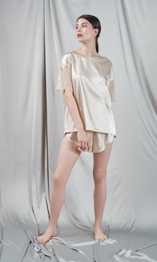 Embrace the ultimate sophistication with our satin and lace t-shirt in an elegant shade of champagne, featuring an alluring lace back. The classic cut of the t-shirt is highlighted by a satin pocket at the front, adding a subtle touch of style. The oversized fit provides the desired comfort, while details like the lace back add a touch of elegance and femininity. Complete this ultra-chic set with lace shorts for a relaxed and refined look or with matching pajama pants for a comfortable and attractive look. A perfect choice for a luxurious style, whatever the occasion.