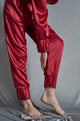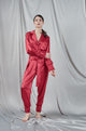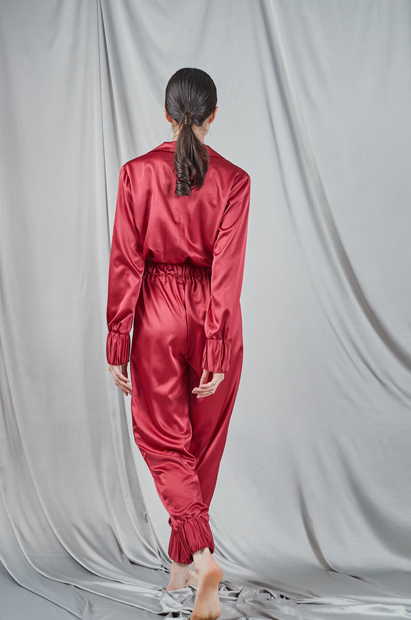 Burgundy jumpsuit, an example of elegance and style, perfect for special occasions or evenings when you want to shine. Made of satin, it combines luxury with comfort, featuring a classic collar, long sleeves and a button closure that allows you to adjust the neckline to your preferences. The waist is emphasized by a wide belt in tone, adding a defined contour to the silhouette. The pants are tight at the ankles, creating an interesting contrast with the generous volume at the hips and giving a modern allure to the entire outfit. The burgundy jumpsuit is ideal for impressing with a refined and memorable appearance.