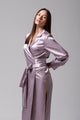 The long pink silk satin kimono wraps around the body and is secured with a belt.